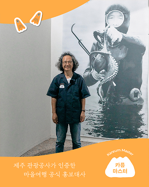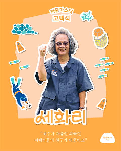 고백석 카름마스터는 육지에서 고등학교 교사로 은퇴한 후, 제주로 이주하여 아내와 함께 ‘철없는펜션'을 운영하고 있습니다. 드라마 등 한국 콘텐츠를 먼저 접하고 한국 문화를 체험하고자 제주를 찾은 외국인 여행자들이 펜션 손님의 반 이상이기 때문에 고백석 카름마스터는 환경부에서 자연환경해설사 자격증을 받아 영어로 해설하는 독보적인 안내자입니다. 천년 비자나무가 자라는 비자림과 다랑쉬오름, 해녀의 삶과 역사를 이해할 수 있는 해녀박물관과 불턱에 담긴 이야기를 외국인 친구와 함께 체험해보시죠!
