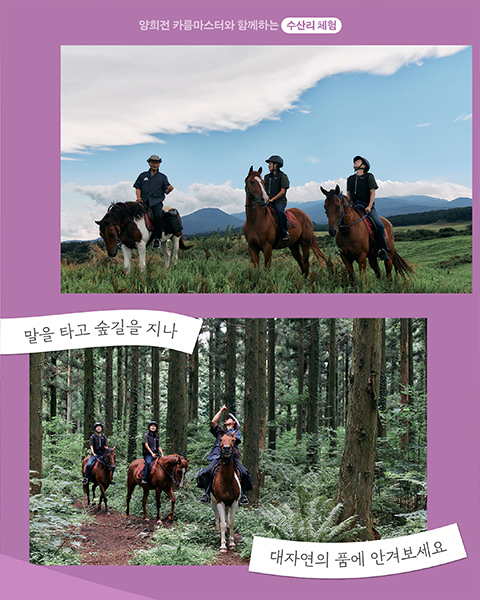 양희전 카름마스터는 일본에서 유기농을 공부하고 고향인 수산리에 뚝심 있게 땅을 일궈 유기농법으로 농사를 짓는 농부입니다. 양희전 카름마스터가 운영하는 물뫼힐링팜에서 유기농 음식을 맛보면 에너지가 차오르고 눈이 번쩍 뜨이는 경험을 하게 되실 거에요. 스트레스가 많고 빠른 속도에 지친 도시여행객들이 동식물과 교감하며 자연과 하나로 연결된 양희전 카름마스터의 순수함을 느끼면서 물메밭담길을 산책하고 말을 타고 오름투어를 하는 동안 잃어버린 자신을 발견하고 평생 잊지 못할 휴식과 치유를 경험할 것입니다.