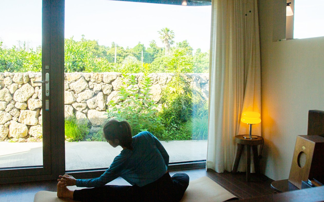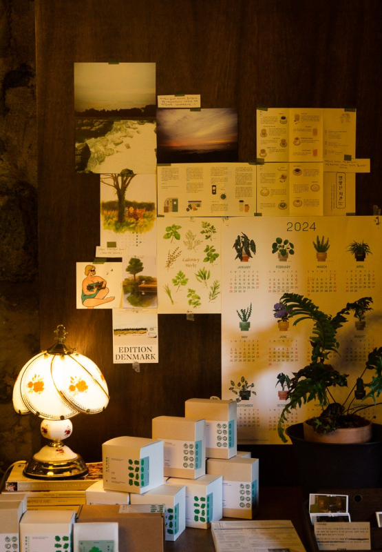 특히 이끼가 자라는 작은 정원이 있는 테라스는 조용한 휴식을 즐기기에 완벽한 공간이에요. 선선한 날씨에는 테라스에 앉아 바람을 맞으며 책을 읽거나 음악을 듣는 것도 좋습니다. CD와 LP로 음악을 듣고, 책을 읽고, 메모를 남기는 시간. 숙소 바로 옆 ‘알맞은 시간’ 카페에서 즐기는 하루 한 잔의 커피는 이곳에서만 경험할 수 있는 특별한 일상이 됩니다. 저녁이면 에어드레서로 옷 냄새를 케어하고, 고체 비누로 씻고, 포근한 침대에 누워 하루를 마무리하는 섬세한 순간들이 기다리고 있죠.