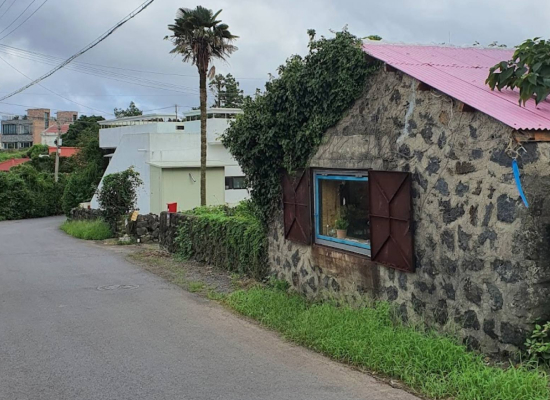<달무지개>는 올레길 4코스의 유일한 기념품샵입니다. 돌담 따라 걷다 보면 보통의 집들 사이 샛분홍색의 지붕이 보입니다. 올망졸망한 글씨로 쓰인 입간판을 지나 돌벽에 나 있는 창문을 엿보면, 여럿이 모여 복작복작 무언가를 만드는 풍경을 볼 수 있지요.