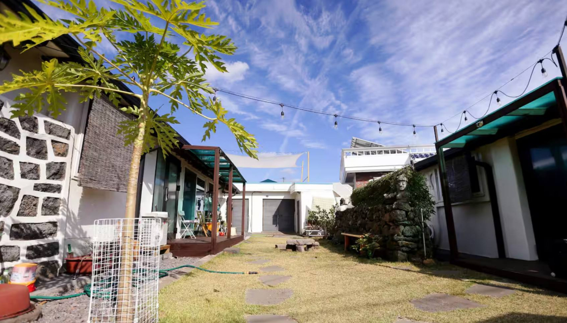 안거리와 밖거리가 마당을 사이에 두고 있는 ‘ㄷ’자 형태의 67년 된 전통 제주 돌집이에요. 2019년 귀농해서 노지감귤을 키우면서 1년 넘게 리모델링 한 숙소랍니다. 제주의 옛 멋을 살리면서도 게스트의 편의를 위해서 최선을 다했어요. 침대에 누워서 서까래의 아름다운 선을 느껴보세요. 빈도롱이는 제주도 방언으로 ‘아무 일도 하지 않고 있는 모양새’를 뜻하고 빈도롱이가에 오셔서 아무일도 하지 않고 편하게 쉬시라는 의미를 담고 있답니다. 입구에는 언제나 시고르 자브종인 반려견 또롱이가 함께 하고있어요.