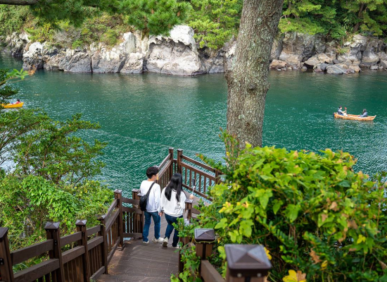 쇠소깍은 제주올레 5코스와 6코스를 연결하는 곳이어서 올레꾼들이 많이 찾습니다. 산책로를 따라 내려가면 검은 모래로 유명한 쇠소깍 해변에 이르는데요. 검은 모래와 절벽에서 바다로 이어지는 분위기가 제주의 여타의 해변과는 다른 신비한 매력을 느낄 수 있게 합니다. 수상 레저는 이 절경을 만끽할 수 있는 방법의 하나입니다. 여유롭게 풍경을 감상하길 원한다면 카약이나 조각배를, 바다가 만들어낸 물보라를 온몸으로 즐기고 싶다면 제트보드를 추천합니다.