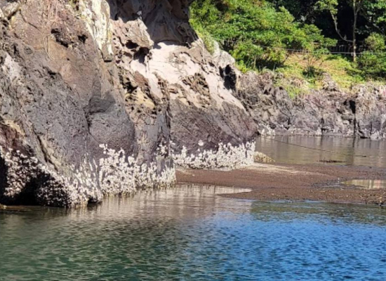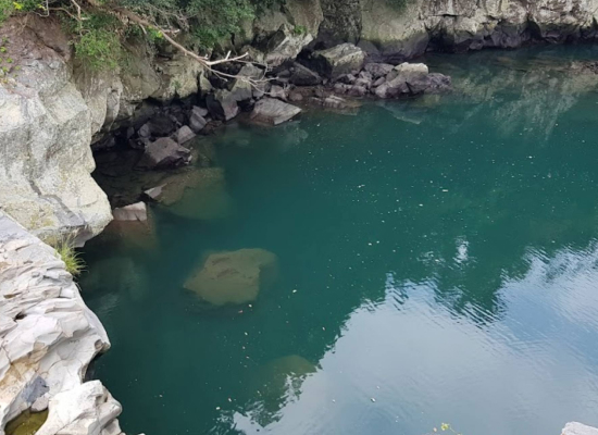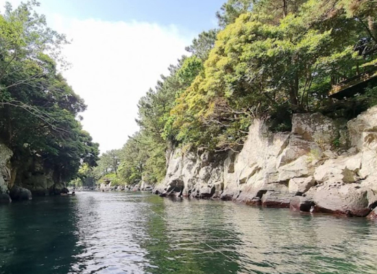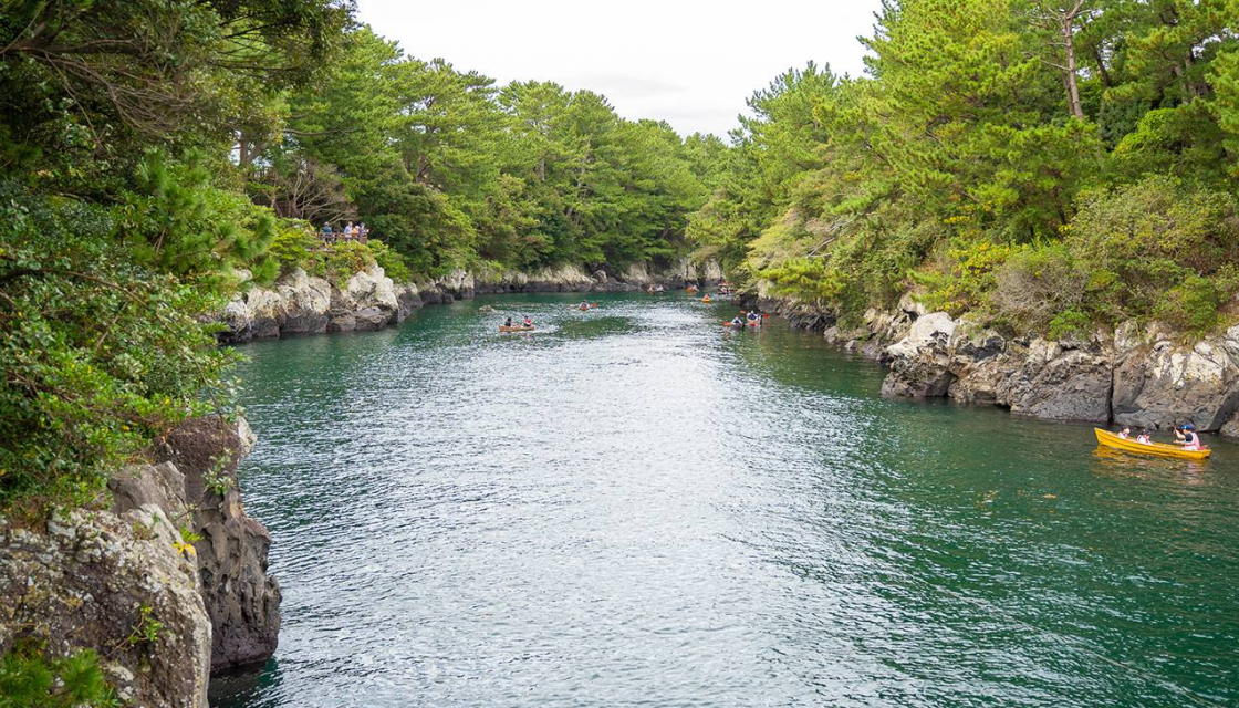쇠소깍은 한라산에서 흘러온 물줄기와 바닷물이 만나 형성된 깊은 웅덩이입니다. 양쪽 벽으로 돌덩이가 병풍처럼 둘러서 있고, 그 위로 숲이 우거져있습니다. 물은 바다색인데 풍경을 보면 계곡과 닮아있어 묘한 기분이 들지요.