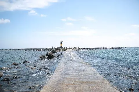 물때를 잘 만나면 열리는 김녕바닷길은 마치 하늘과 이어진 것 같아 천국으로 가는 듯한 묘한 기분이 듭니다.