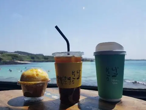 제주도의 맑은 하늘 아래, 돌고래를 보러 가는 길에 들른 근처 카페에서 잠시 쉬어갔어요☕🌊