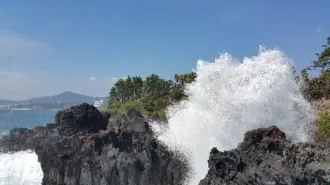 , 신이 다듬은 듯 정교하게 겹겹이 쌓은 검붉은 육모꼴의 돌기둥이 병풍처럼 둘러쳐져 있는 중문관광단지 동부지역 해안가의 주상절리대는 자연의 위대함과 절묘함을 동시에 느낄 수 있는 천혜의 관광자원으로, 제주도 지정문화재 기념물 제50호다. 아득한 옛날 지각변동으로 인해 이루어진 주상절리대를 보고 있으면 새하얗게 부서지는 포말 속에 석수장이의 애달픈 사연이라도 금새 실려오는 듯하다. 파도가 심하게 일때는 높이 20m 이상 용솟음 치는 장관을 연출한다. 천혜의 절경