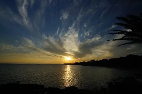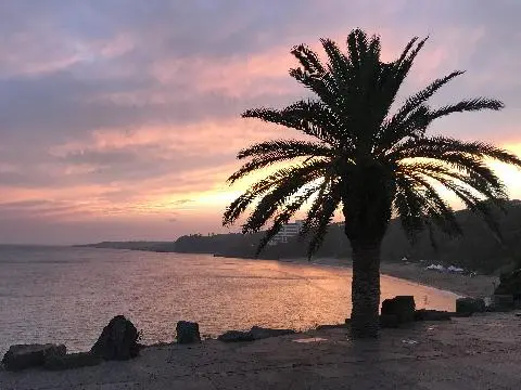노을진 하늘에 파도에 깎여 몽골몽골한 검은 바위가 매우 인상적입니다.