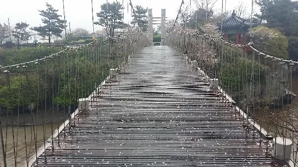 4월 심한 비바람에 흩어진 벗꽃잎이 깔린 용연 흔들다리