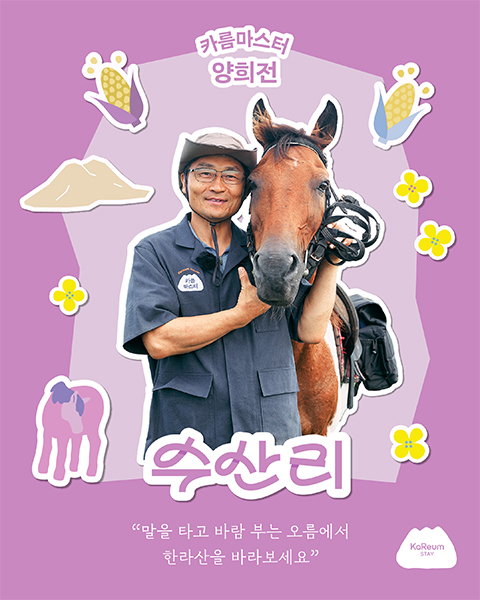 양희전 카름마스터는 일본에서 유기농을 공부하고 고향인 수산리에 뚝심 있게 땅을 일궈 유기농법으로 농사를 짓는 농부입니다. 양희전 카름마스터가 운영하는 물뫼힐링팜에서 유기농 음식을 맛보면 에너지가 차오르고 눈이 번쩍 뜨이는 경험을 하게 되실 거에요. 스트레스가 많고 빠른 속도에 지친 도시여행객들이 동식물과 교감하며 자연과 하나로 연결된 양희전 카름마스터의 순수함을 느끼면서 물메밭담길을 산책하고 말을 타고 오름투어를 하는 동안 잃어버린 자신을 발견하고 평생 잊지 못할 휴식과 치유를 경험할 것입니다.