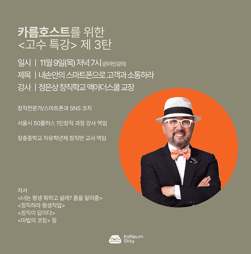 제주관광공사에서 카름스테이 호스트 분들을 위해 스마트폰을 활용해 보다 친밀하게 고객을 만날 수 있는 방법을 알려줄 국내 최고의 강사를 모셨습니다.