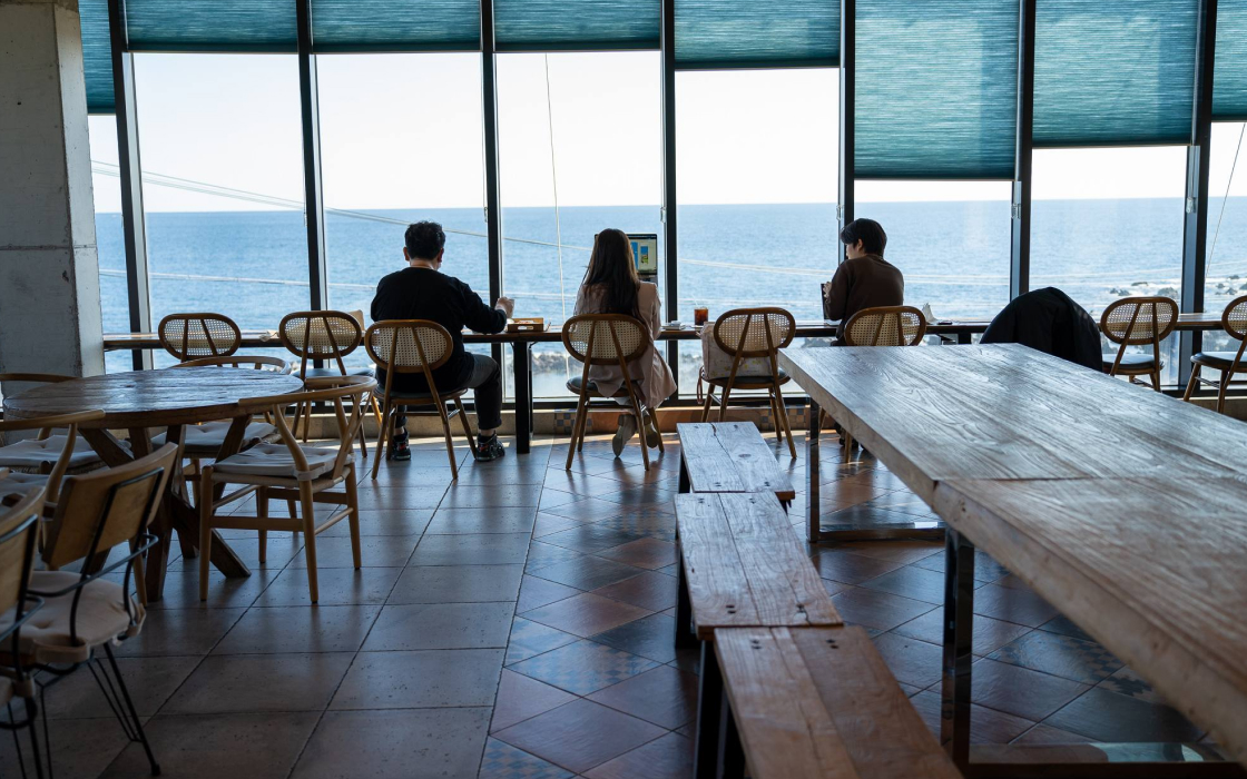 게우지코지는 두 개의 건물로 구성되어 있으며, 각각의 공간마다 색다른 매력을 지니고 있어요. 2층 테라스에서는 바다를 바라보며 커피 한 잔의 여유를 만끽할 수 있고, 3층 옥상에 오르면 쇠소깍과 하효마을의 전경이 파노라마처럼 펼쳐집니다. 특히, 이곳은 운이 좋다면 바다를 유영하는 돌고래 가족을 만날 수 있는 곳으로도 유명해요.