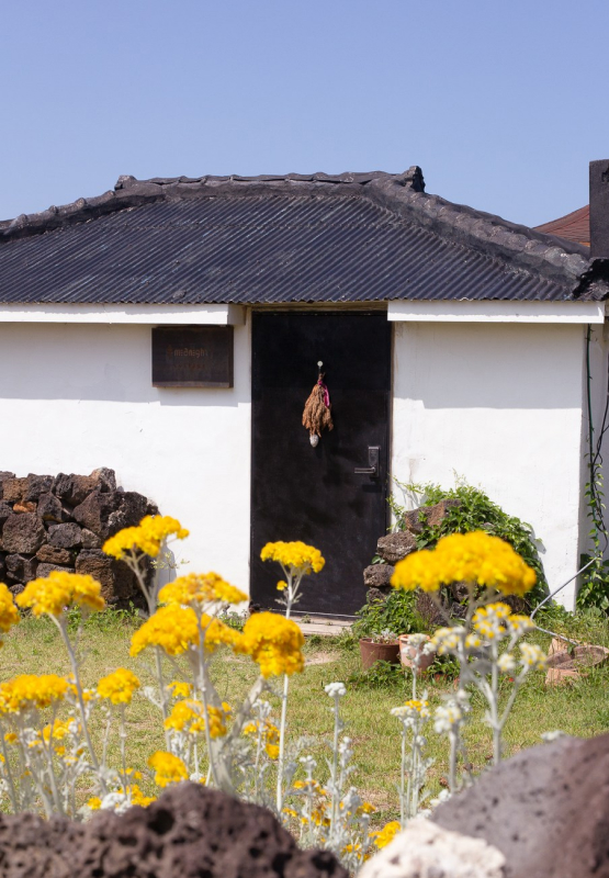 미드나잇코티지’는 오래된 제주 가옥을 개조한 특별한 공간이에요. “원래 이곳 옆에서 꽃집을 운영하고 있었어요. 어느 날 이 구옥을 보게 됐는데, 제주 바다와 마을의 일상이 고스란히 담겨있는 모습이 너무 예뻤죠. 그래서 최대한 본래의 모습을 살리면서 현대적 편안함을 더했습니다.” 꽃을 사랑하는 주인장의 이야기처럼, 이곳에는 제주의 정취와 현대적 감각이 조화롭게 어우러져 있습니다.