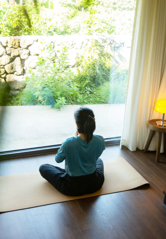 특히 이끼가 자라는 작은 정원이 있는 테라스는 조용한 휴식을 즐기기에 완벽한 공간이에요. 선선한 날씨에는 테라스에 앉아 바람을 맞으며 책을 읽거나 음악을 듣는 것도 좋습니다. CD와 LP로 음악을 듣고, 책을 읽고, 메모를 남기는 시간. 숙소 바로 옆 ‘알맞은 시간’ 카페에서 즐기는 하루 한 잔의 커피는 이곳에서만 경험할 수 있는 특별한 일상이 됩니다. 저녁이면 에어드레서로 옷 냄새를 케어하고, 고체 비누로 씻고, 포근한 침대에 누워 하루를 마무리하는 섬세한 순간들이 기다리고 있죠.