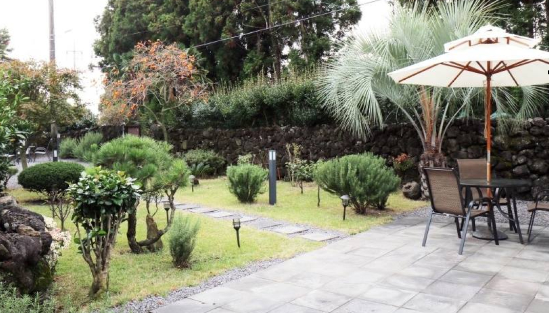 - 야외 정원 흰색 파라솔 의자. 커피 한 잔 마시면서 한라산을 바라볼 수 있어요.