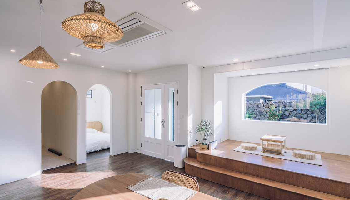 제주의 한적한 바다마을 김녕리에 위치한 프라이빗 하우스입니다. 하얀색과 나무톤이 어우러져 편안한 느낌이 들 거예요. 취향을 듬뿍 담아 CD와 책들을 준비했어요. 오직 둘 만을 위한 호젓한 영화관이 되는 무비룸이 준비되어 있답니다. 타일 욕조에 몸을 푹 담근다면 그 무엇보다 나른하고 온전한 휴식을 만끽하실 수 있을 거예요. 당신을 위한 좋은 집, 스테이 호재.