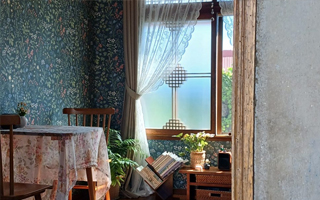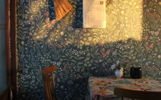 - 레트로 감성의 녹색 꽃무늬 벽지와 세월의 흔적이 담긴 벽장