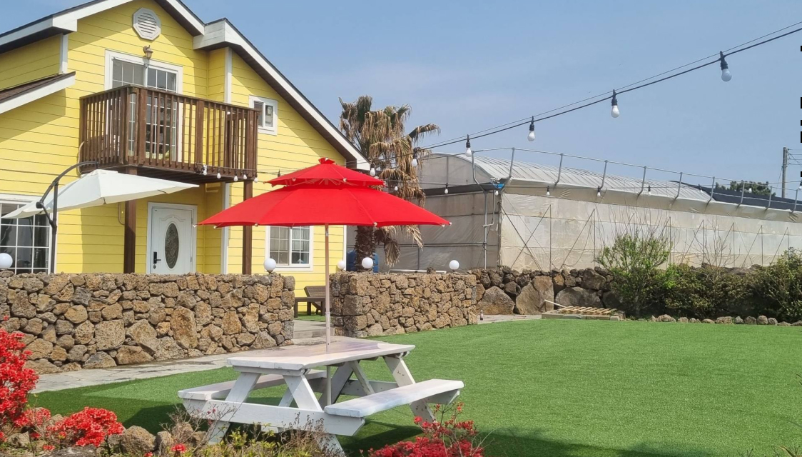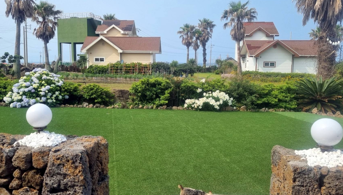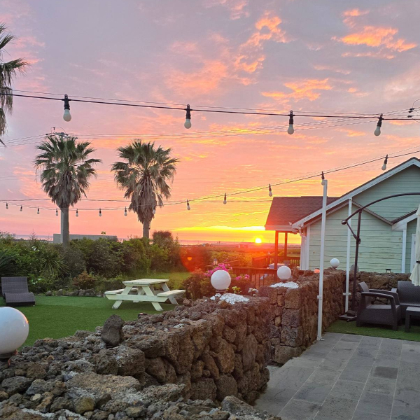 돌고래 뛰는 푸른 바다와 밤엔 보랏빛 노을, 야자수 정원·돌담 바베큐가 매력적인 곳. 홍시네는 돌고래가 뛰어노는 푸른 제주 바다를 앞에 두고 있어요. 넓은 초록 잔디 마당에서 보이는 바다는 밤이면 보랏빛 영롱한 노을을 볼 수 있답니다. 커다란 야자수가 반겨주는 초록 초록한 정원과, 제주 흙 돌담으로 둘러싸인 바베큐 장에서 특별한 저녁을 보내보세요.