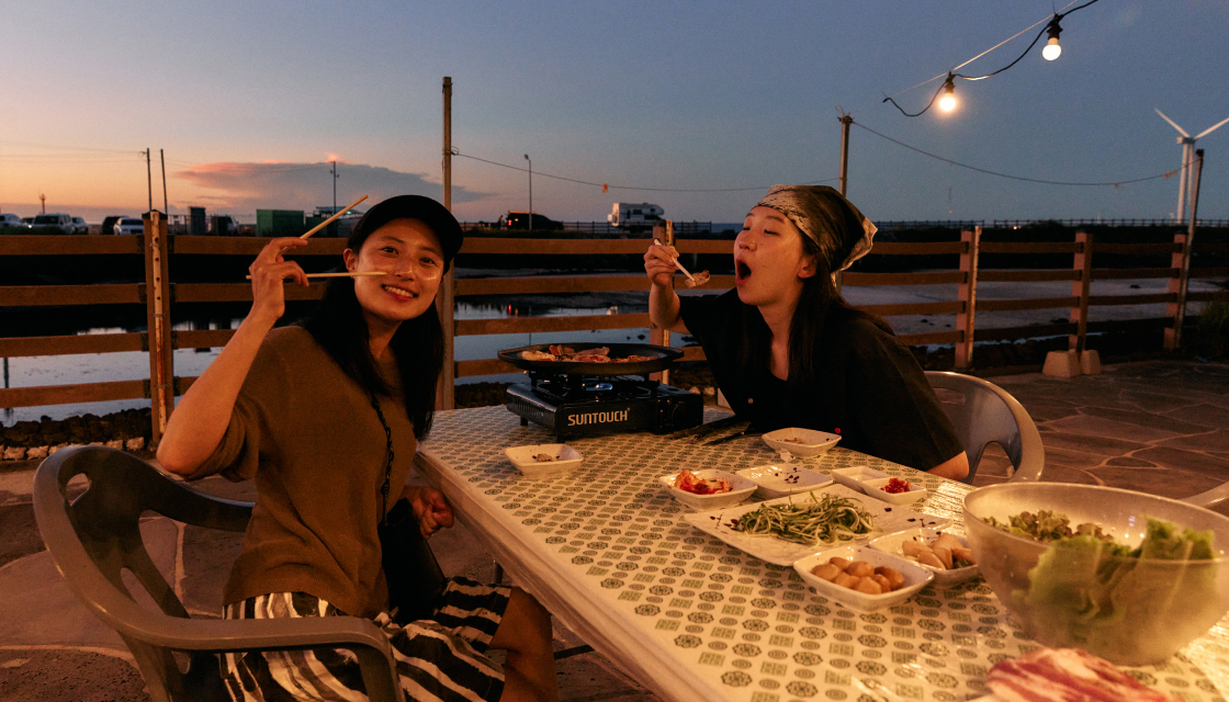 동쪽 바다에 노을이 스며드는 김녕리 해안에서 갓 잡은 싱싱한 해산물과 함께 바비큐를 즐기고, 마을 삼춘들과 둘러앉아 나누는 정겨운 이야기 속에서 특별한 맛과 정이 쌓여갑니다.