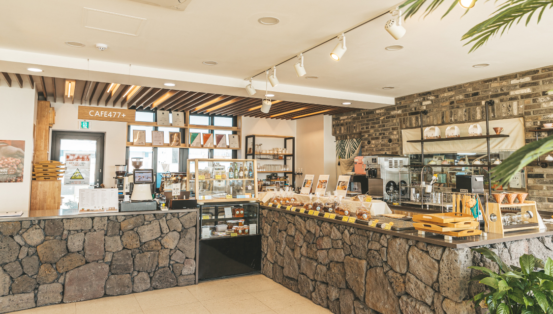 "477"은 2019년 유명한 관광지 하나 없던 세화리를 전국에 알리고 사람들의 발길이 머물며 다시 찾아오고 싶은 마을로 발전시켜보고자 대한민국 최대 규모의 협동조합을 설립하게 되면서 당시 뜻을 함께하게 된 최초의 출자 조합원 수를 의미하고, 앞으로 뜻을 함께 할 더 많은 조합원을 의미하는 “+”가 합쳐져 카페477+라는 이름이 탄생하게 되었어요.