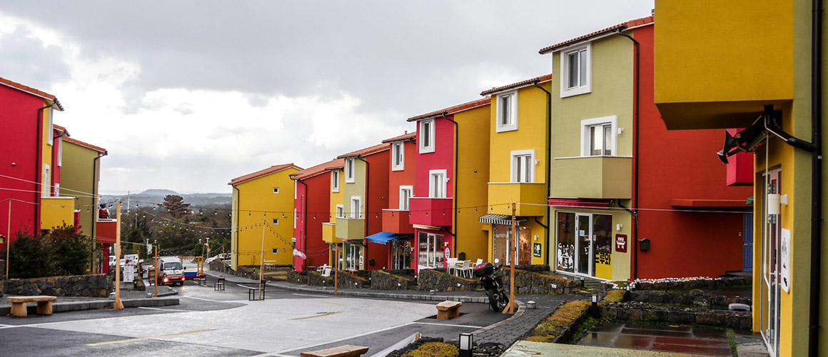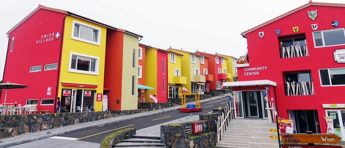 Swiss Village, terletak di Hamwa-ro 566-27, Jocheon-eup, Jeju-si, Jeju, menampilkan barisan cantik bangunan-bangunan gaya rumah bandar yang berwarna-warni. Seni bina dan reka bentuk yang ketara ini mengingatkan reka bentuk Swiss, oleh itu namanya “Swiss Village”. Ini merupakan tempat penting untuk peluang foto, terutamanya untuk foto perkahwinan & pertunangan, kerana bangunan yang berwarna-warni ini menawarkan unsur yang unik dan menarik kepada foto tersebut. Rumah bandar 3 tingkat ini mempunyai ruang komersial pada tingkat satu dan ruang kediaman pada tingkat dua dan tiga. Anda juga boleh menemui rumah tamu yang terletak di sini. Untuk mendapatkan maklumat lanjut, hubungi 064-744-6060.