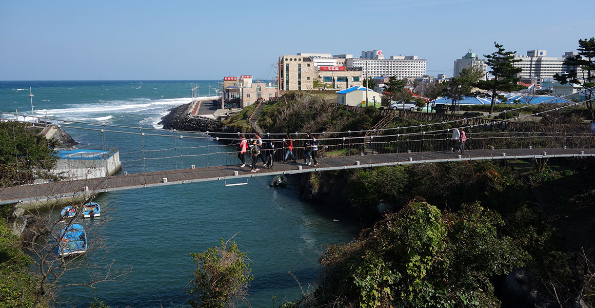 Jambatan Saeyeongyo terletak di 40 Namsungjoong-ro, Seogwipo-si dan menyambungkan Pelabuhan Seogwipo Port dan Pulau Saeseom, zon pemuliharaan hutan temperat. Jambatan ini merupakan laluan atas pejalan kaki yang panjang,diinspirasikan oleh reka bentuk “Tewu”, bot log tradisional Jeju. Untuk mendapatkan maklumat lanjut, dail 064-760-3471.