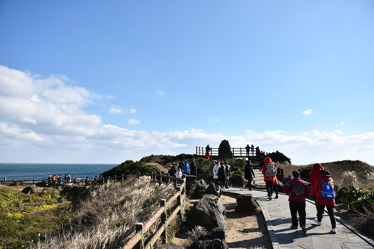 First stop:SeopjikojiSeopjikoji, which is located at the east coast of Jeju Special Self-Governing Province, is a beautiful coastline filled with canola flowers during the spring, with Seongsan Ilchulbong Peak rising up in the background. You can find Sinyang Sandy Beach at the entrance, while the end will let you see the traditional beauties of Jeju, such as a vast land filled with canola flowers growing on a hill, Jeju ponies grazing peacefully, beautiful rocky cliffs, and the legendary Seonbawi Rock standing in the middle of the ocean.