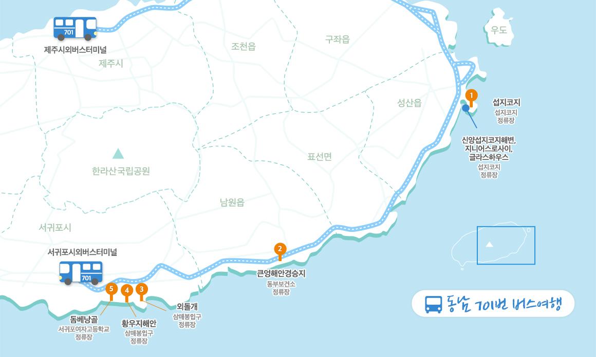 - 이동DELSee half the island by bus!Journey southeast on bus 201As you travel by bus along the coastal road which encompasses Jeju Island, you can calmly and safely enjoy just looking out the window and marvelling at the must-see sites along the route. Places like the famed Seopjikoji coastline and its many filming locations, the 200-meter cliff at Namwon and of course, the iconic Oedolgae rock, all which are just waiting to be discovered! Here is an itinerary for the bus 201 route (formerly bus 701).